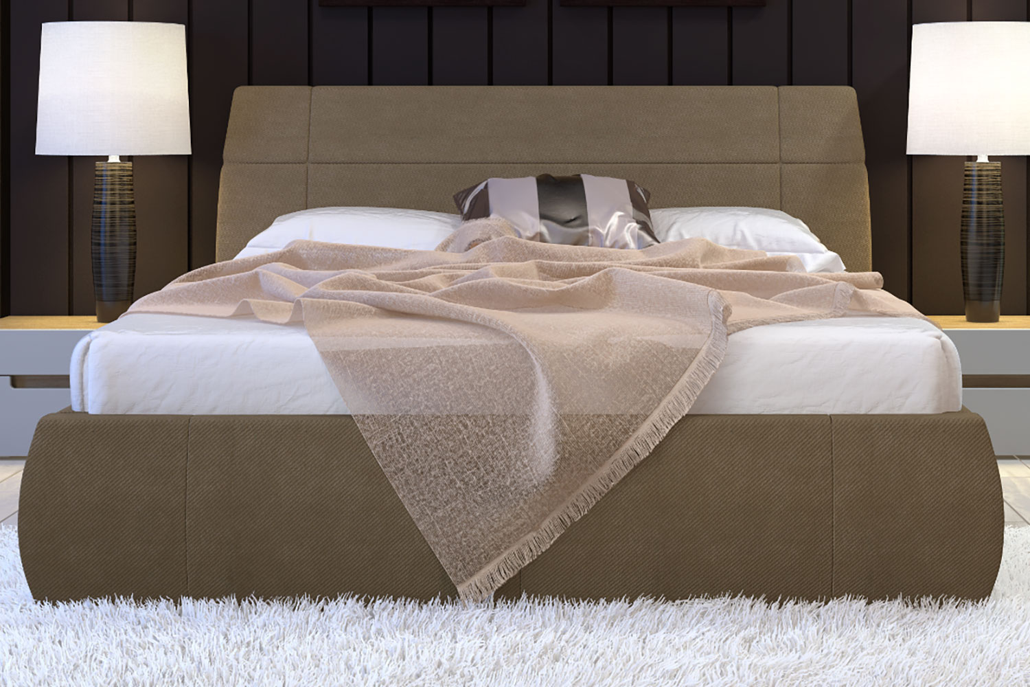 Элегантная лаконичная модель станет притягательным центром спальни в стиле неоклассика, кантри, сканди или минимализм. Теплый оттенок «швейцарский вяз» великолепно гармонирует с плавными контурами мебели и бархатистой фактурой обивки. Мягкий каркас изготовлен из высокоэластичного пенополиуретана, спанбонда и синтепона — такая отделка обеспечивает полную безопасность при эксплуатации изделия. Минималистично оформленное изголовье декорировано тонкими линиями утяжных элементов.