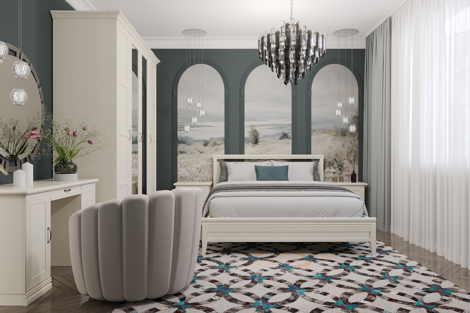 Чтобы сделать интерьер более завершенным, вы можете дополнительно приобрести металлические аксессуары в бронзовых оттенках и абстрактные постеры с яркими акцентами. Для большего удобства композицию можно завершить мягким пуфом или банкеткой в тон мебели. Конечно же, не забудьте про туалетный столик, который сделает утренние и вечерние ритуалы еще приятнее.